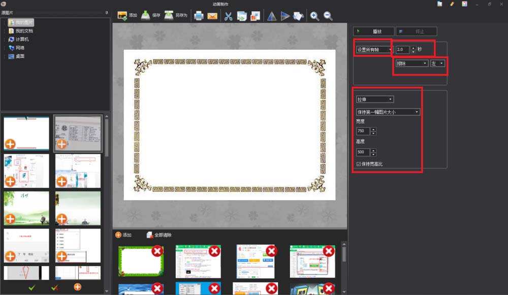 4、选择设置所有帧(也可以选择当前帧)——设置时间——然后选择并设置动画效果——设置剧中或拉伸——设置宽高比例。