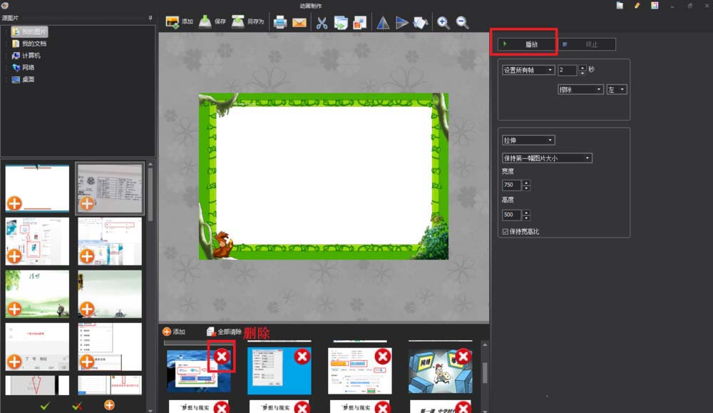 5、点击播放,查看效果——如果觉得有些图片不满意,点击下方每张图片右上角的X就可以删除了。要排序位置就直接拖动下方的图片去到指定的地方就可以了。