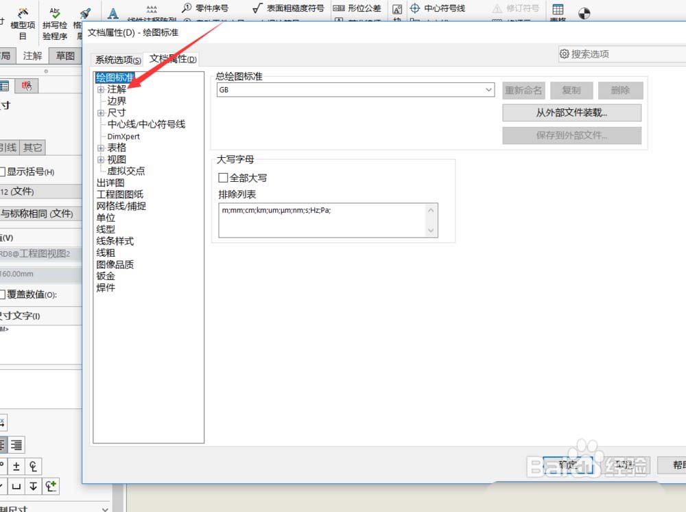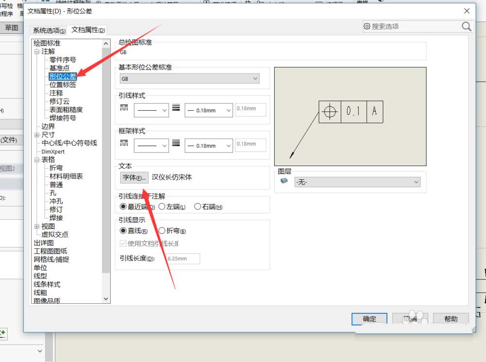 3、之后在文档属性下可以修改所有地方的字体大小,以形位公差为例,打开注解。