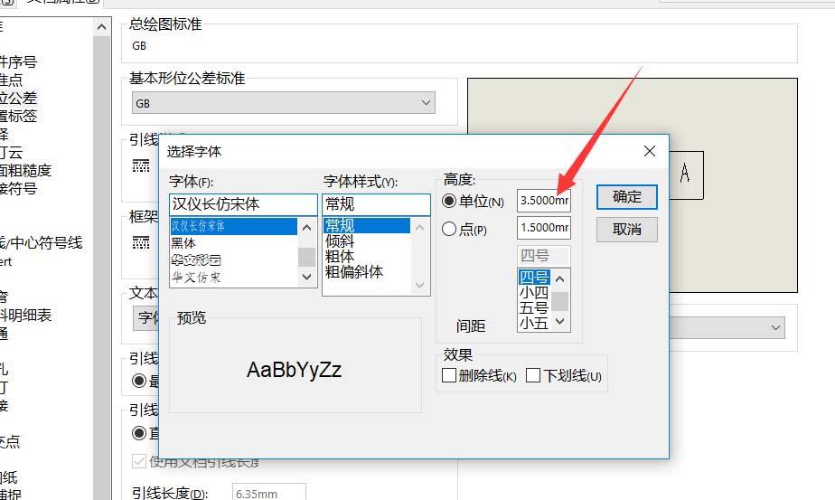 5、点开字体,将字体右侧的数值修改,然后确定即可改变图纸上形位公差字体的大小。