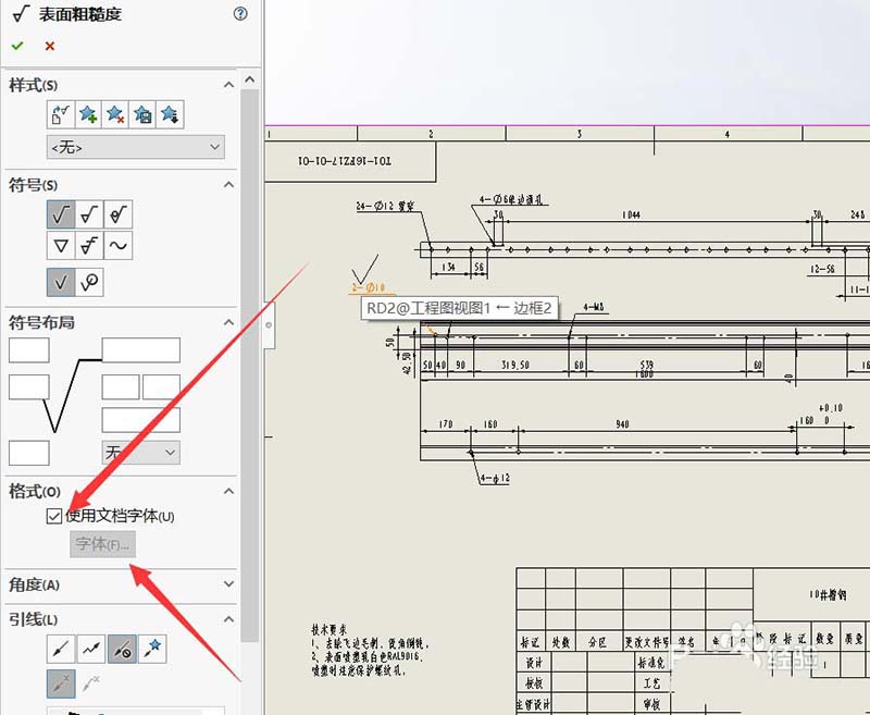 6、有一些数值,比如说粗糙度字体大小可以在选中之后在左侧的命令栏直接勾选掉字体前面的对勾,然后点击字体进行修改。