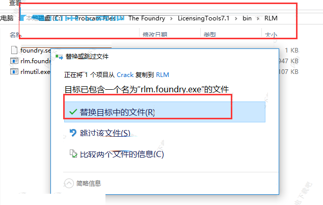 11、将破解的rlm.foundry.exe复制到软件安装目录中,默认路径为C:\ Program Files \ The Foundry \ LicensingTools7.1 \ bin \ RLM \ rlm.foundry.exe,如图所示,点击替换目标中的文件