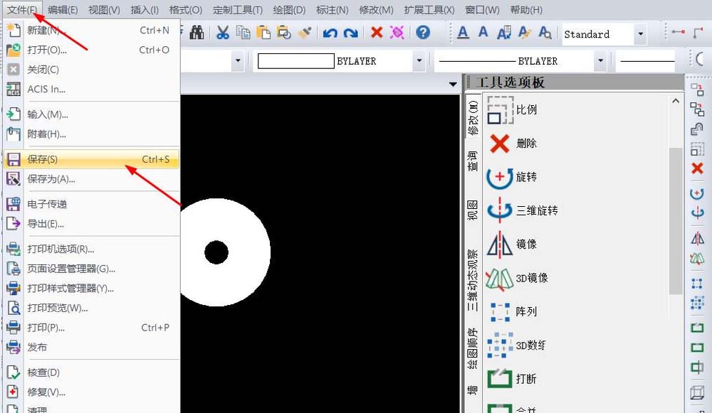 4、在我们绘制完圆环之后,我们需要对圆环进行保存,首先点击左上角的文件,进入到该界面,然后点击下拉框里面的保存或者是另存为,然后就可以对绘制的图纸进行保存了。