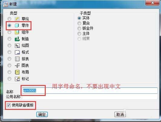 2、选择零件,用字母或者数字对文件命名,勾选缺省模式