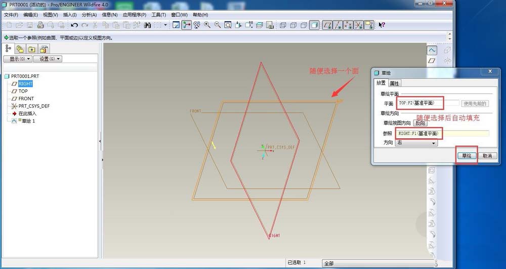 4、随便选择一个面作为基准面,---草绘