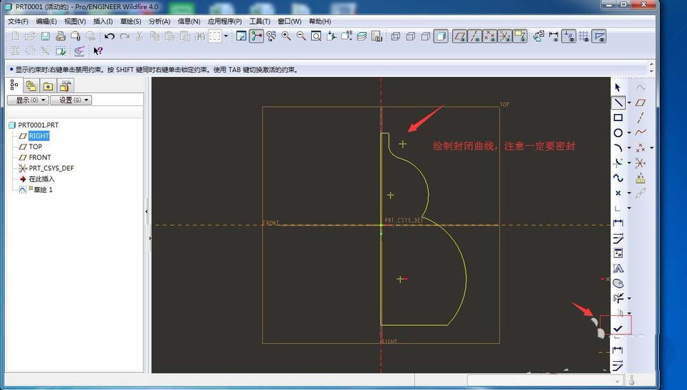 6、在中心线的一侧绘制封闭曲线,绘制完之后在右下角点击√