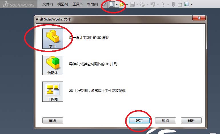 1、如下图所示,打开SolidWorks软件,点击标题栏中的“新建”图标,在弹出的“新建SolidWorks文件”对话框中点击“零件”,再点击对话框右下角的“确定”。