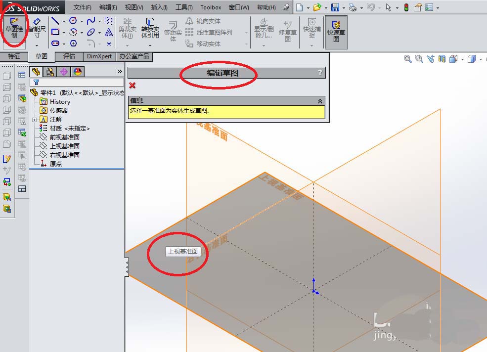 2、如下图所示,在草图工具栏中点击“草图绘制”图标,然后,出现了“编辑草图”对话框和三大基准面,再然后,我们选择其中一个基准面。(笔者选择了上视基准面)