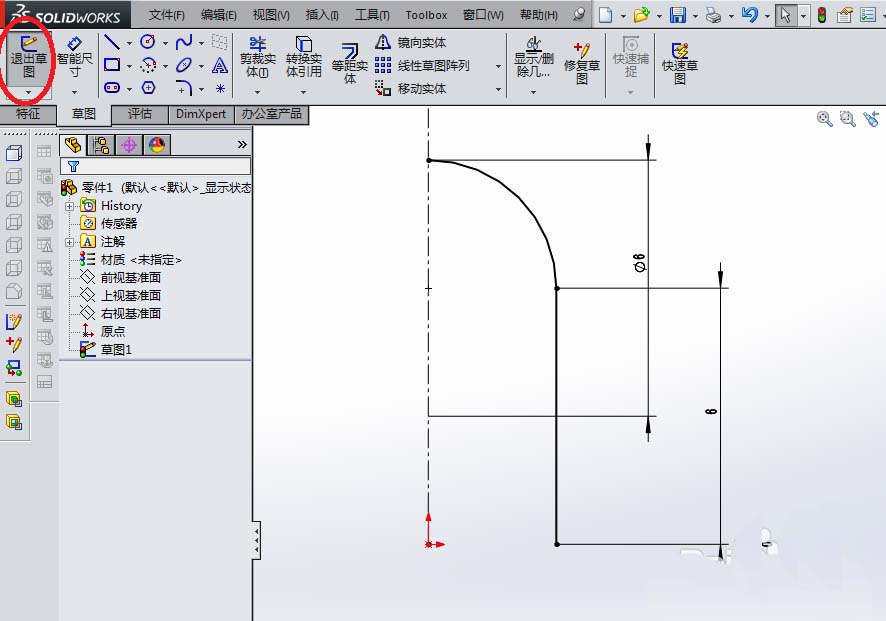 以坐标原点为起点画一条中心距,在草图工具栏中点击“圆”图标,在中心线上画一个圆,尺寸随心,继续在草图工具栏中点击“直线”图标,画一条竖直方向的与刚刚画的圆相切的实线,点击工具栏中的裁剪命令,将圆裁剪成只剩下1/4,就如下图所示的样子就行,点击工具栏中的“智能尺寸”,按下图所示的效果进行标注,点击工具栏中的左上角的“退出草图”。