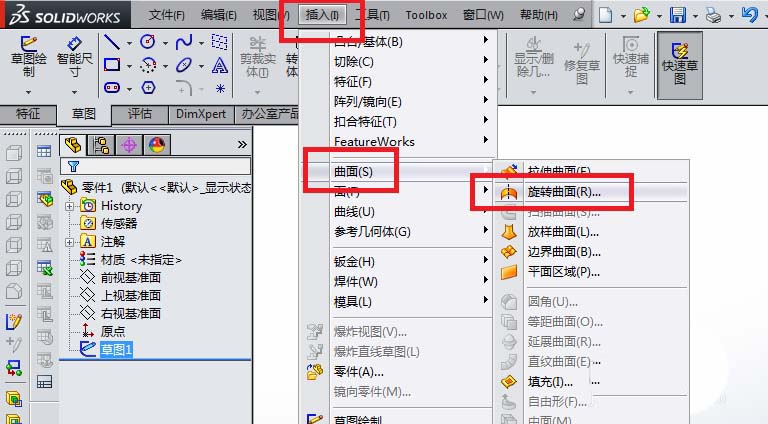 2)点击其下拉菜单中的“曲面”,继续展开下一层下拉菜单,