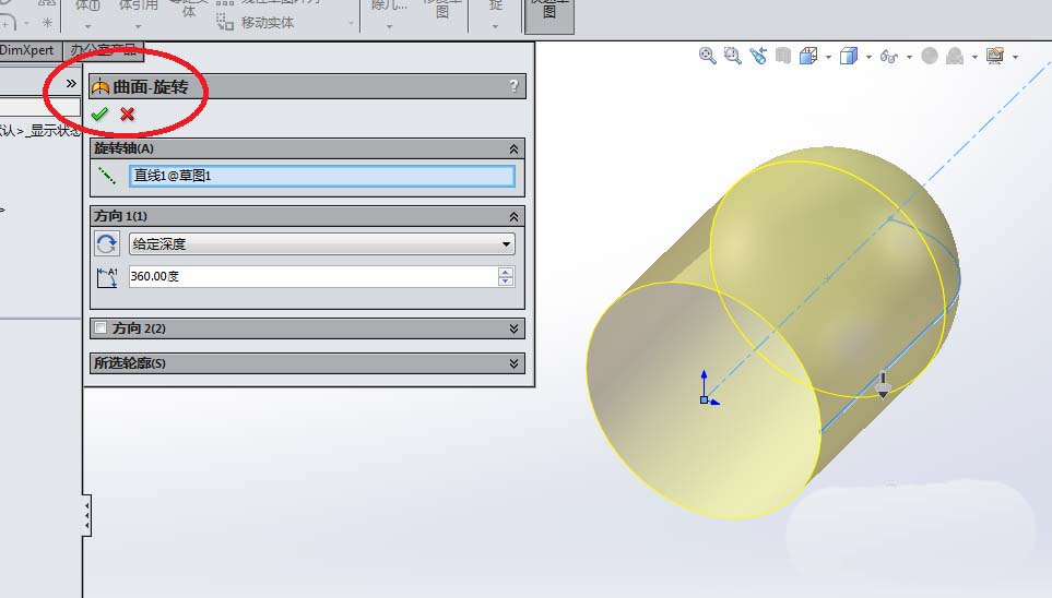 5、如下图所示,出现“曲面-旋转”对话框,看到预览效果,可以直接点击对话框左上角的√。