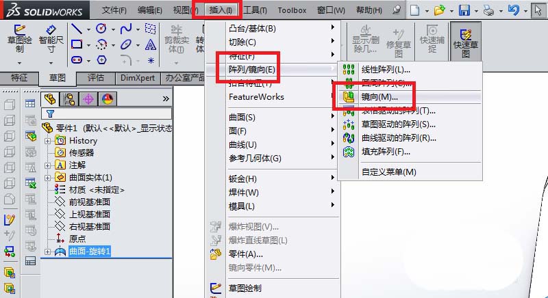 1)在“要镜向的实体”一栏选择刚刚旋转生产的曲面,