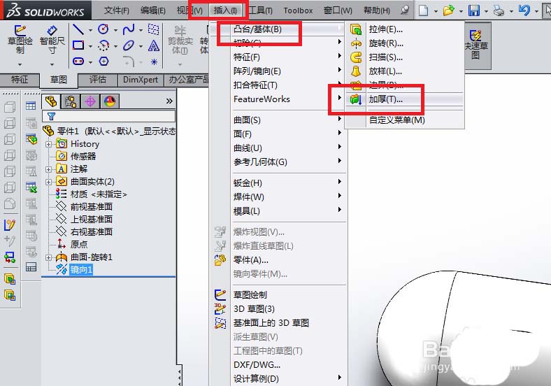 2)点击下拉菜单中的“凸台/基体”,展开第二层下拉菜单,