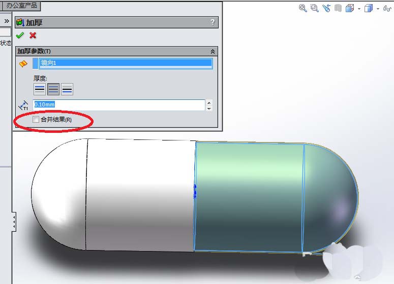 10、如下图所示,用上一步相同的步骤对镜向的那头进行加厚。注意红色框选,默认的是勾选了这个“合并结果”,我们要手工给他取消。