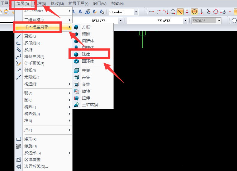 1、打开软件,选择上方属性栏上面的“绘图”选择“平面模型网格”里面的“球体”选项然后进行点击即可!