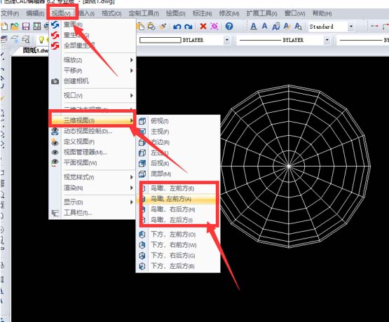 4、绘制完成时候在上方属性栏上面选择“视图”-“三维视图”-“鸟瞰”然后选择点击!