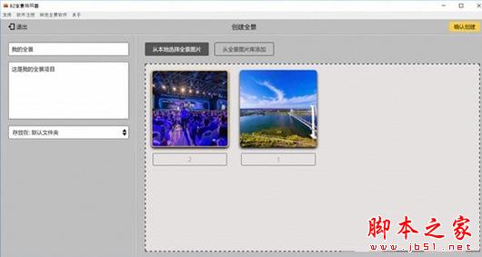 在主界面上面,点击”+创建全景”,进入创建全景界面,可以选择打开本地的全景图片(2:1球面图,或者六张六面体图片),待图片处理完成后,可以点击确认创建按钮创建.在确认创建之前,也可以填写全景名称,全景简介等基本信息