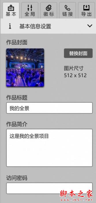 在基本配置栏,可以配置全景的名称,作品简介信息,以及访问密码