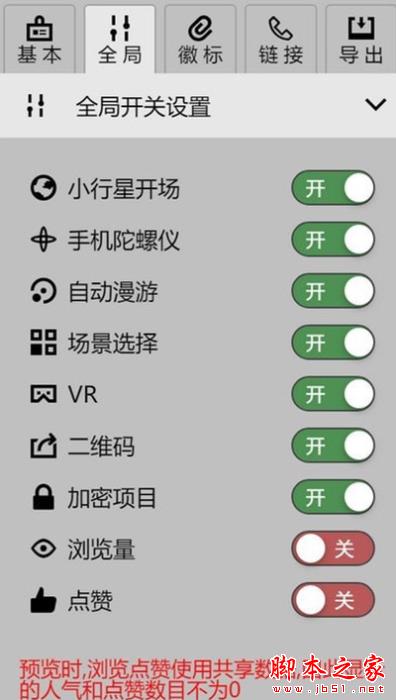在全局设置栏,可以设置是否打开小行星开场,手机陀螺仪,自动漫游,场景选择缩略图,VR,二维码,加密,浏览点赞