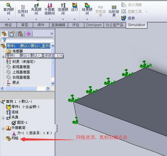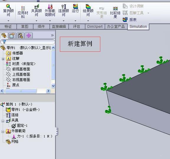 1、按照正常步骤进行算例的创建,添加材料、固定几何体、添加载荷等步骤。