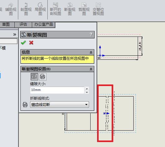 4、如下图所示,选择红色框选中的视图,然后,“断裂视图”对话框就变了,出现了视图的设置一栏。