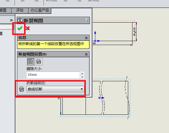 7、如下图所示,将折断线样式改成“曲线切断”,然后,点击对话框左上角的√,完成断裂视图的创建。