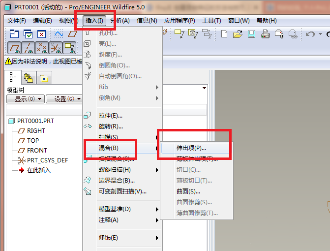 1、如下图所示,打开Pro/e5.0软件,新建一个实体零件,使软件进入到三维建模状态,然后执行下图中的操作:【插入——混合——伸出项】。