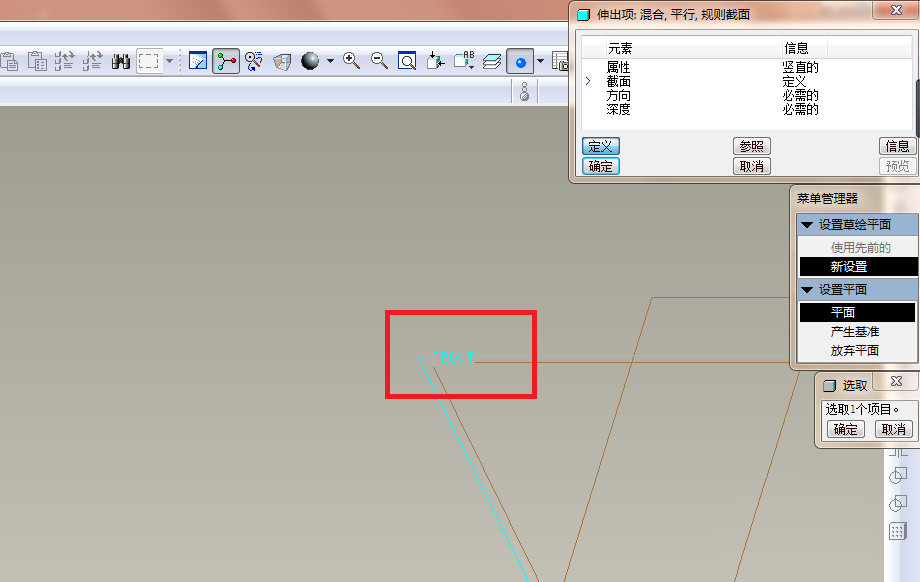 3、如下图所示,一个“伸出项”的对话框出现了,菜单管理器中的属性默认是“直的”,所以点击“完成”。