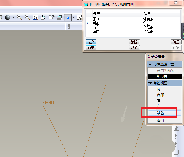 4、如下图所示,根据菜单管理器中的要求,选择“FRONT”基准面。