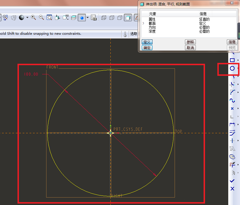 7、如下图所示,进入到草绘界面,点击右边工具栏中的“圆”,以坐标原点为圆心画一个直径100的圆。