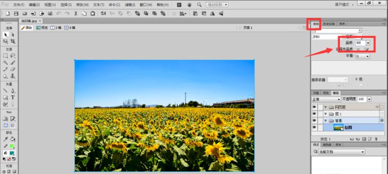 然后我们打开fireworks工具,将图片放入其中,在右侧属性栏中打开优化选项,将品质调整为90,