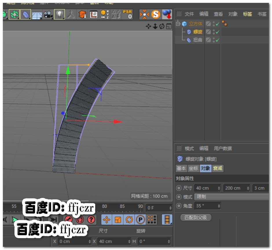 3、选用螺旋变形器,将变形器置于立方体的子级;点击变形器属性栏中的匹配到父级,将强度修改为35度。