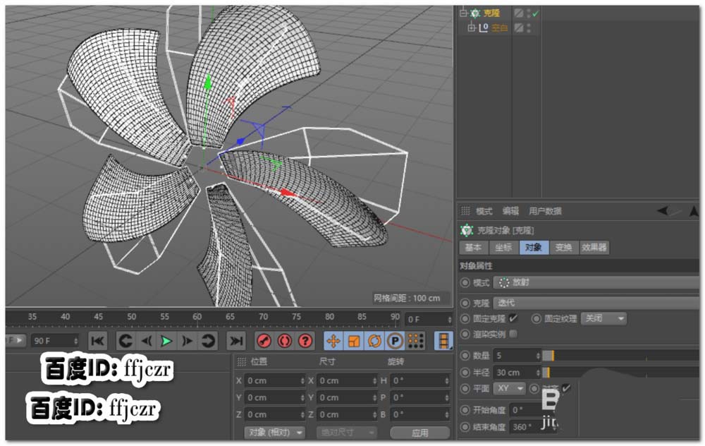 6、选用克隆,将空白对象置于其子级。调整参数:将模式调整为放射,数量为5,半径为30,平面为XY。