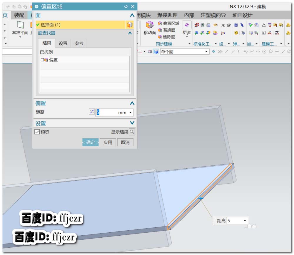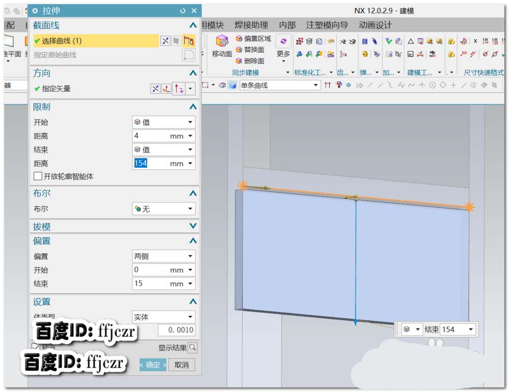 3、选用拉伸命令,截面线为方格的上边线;向下拉伸,开始值为4,结束值为154,布尔为无;进行两侧偏置,开始值为0,结束值为15.即可得到抽屏的前面板。选用偏置面命令,将面板左右面向内偏置1CM,使面板与方格之间存在空隙,以方便抽屏的拉推。