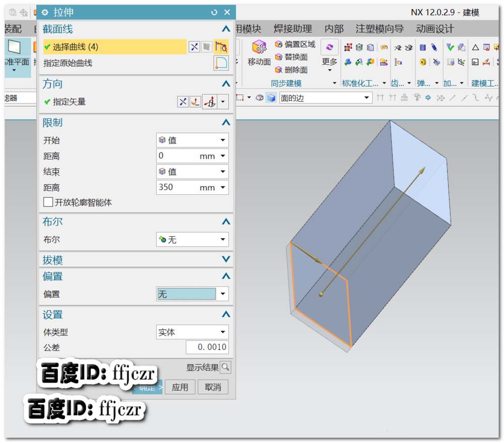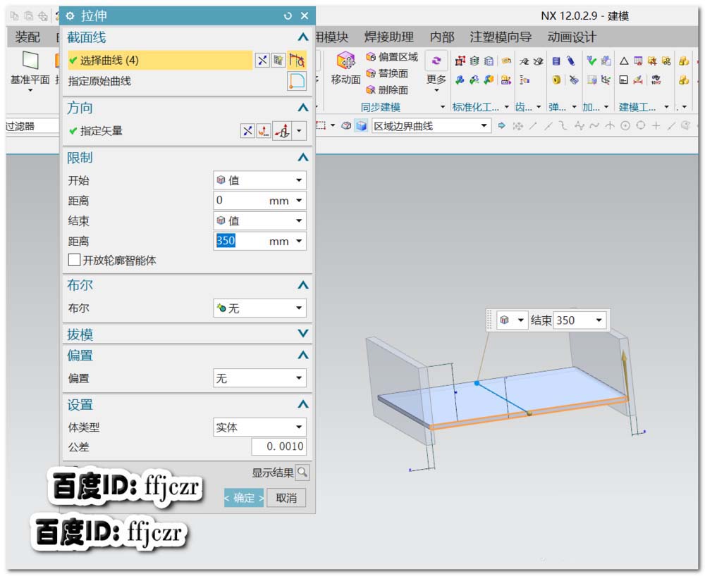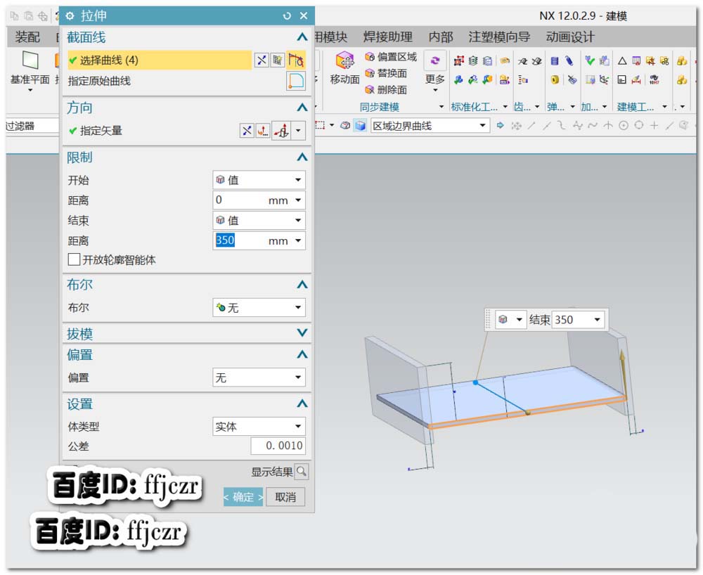 8、回到拉伸对话框,开始值为0,结束值为350.布尔为无,确定后得到抽屉的底板。