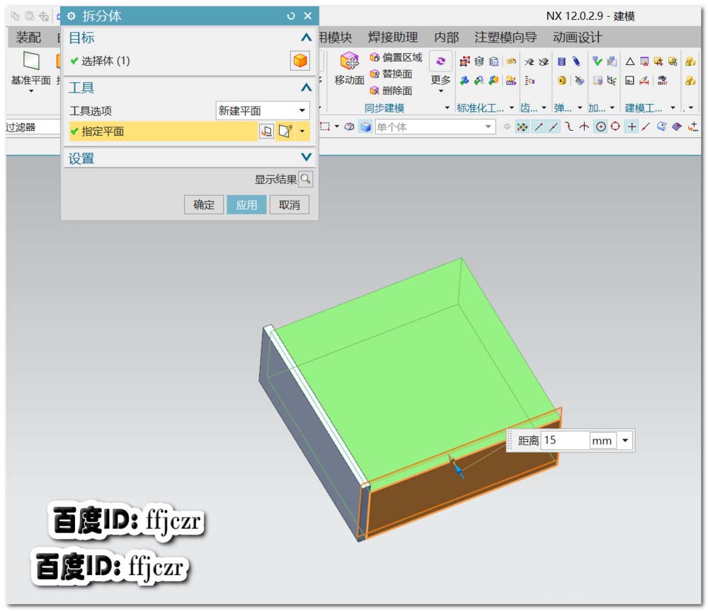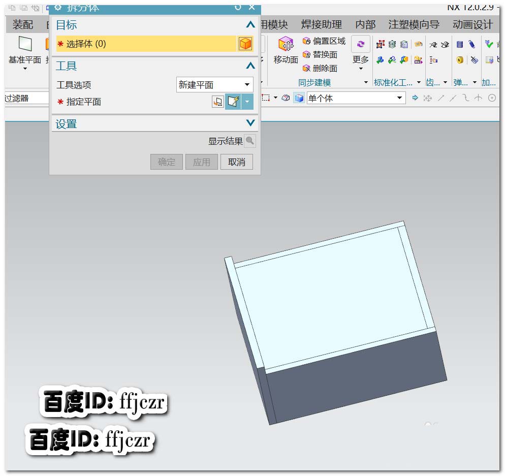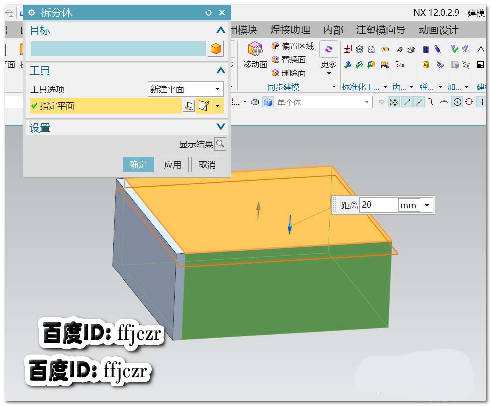 5、选用拆分体命令,拆分对象为上步拉伸得到的实体。工具体平面为实体面的向下20的距离。选用删除体命令,将拆分的上部实体删除掉。
