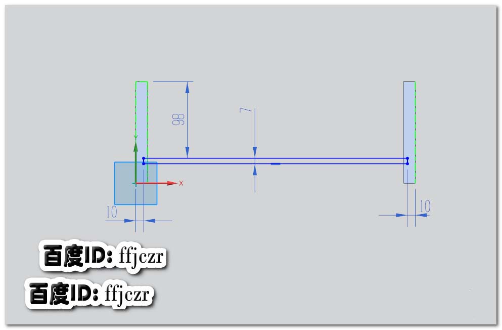 7、选用拉伸命令,以抽屉左右围板的端面为草绘平面;在草绘中依据图中所示的尺寸,绘出一高为7的矩形,矩形的两端与左右两边围板的距离为10.到顶端的距离为98.