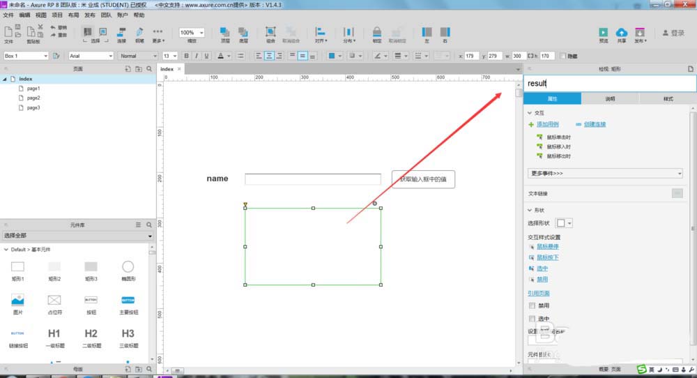 4、获取到输入框的数值后,并赋予变量,下面需要给矩形框赋值,因为这个交互是同时触发的,因此也是在按钮的鼠标单击时做交互,我们只需要将矩形框的值等于刚刚定义的变量值即可,如下图所示。