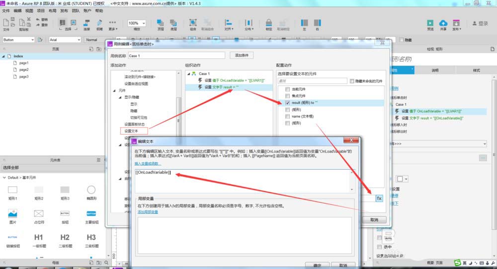 3、元件样式及名称设定好之后,开始对按钮的属性交互事件进行编辑,首先我们需要在鼠标单击时获取文本框中的数值,并将数据赋予定义的变量,如下图所示。