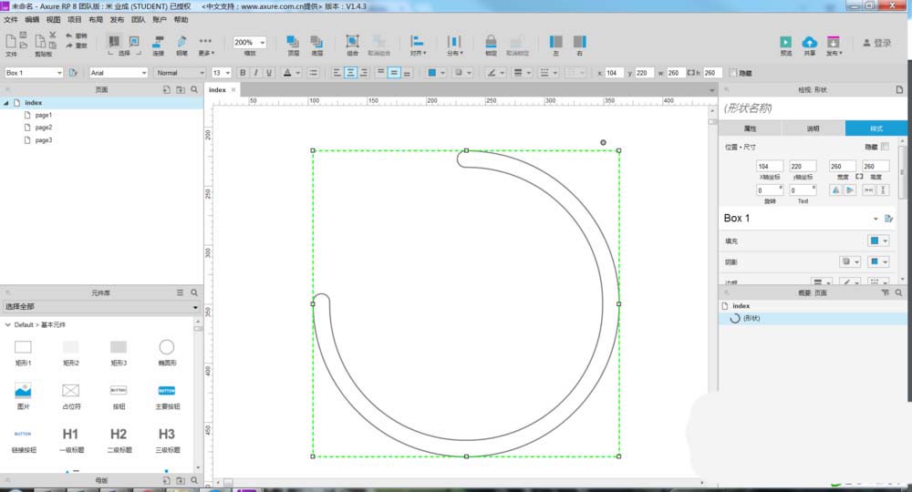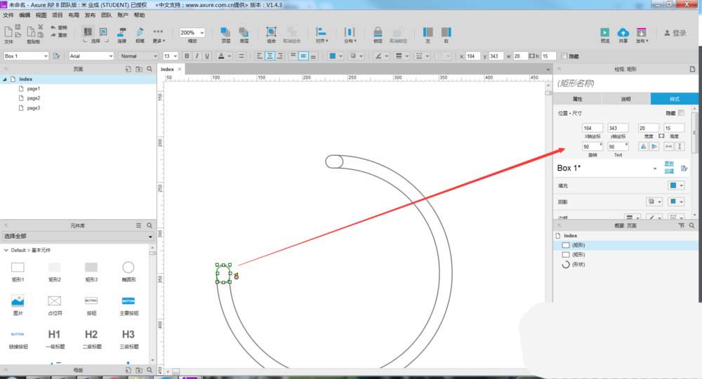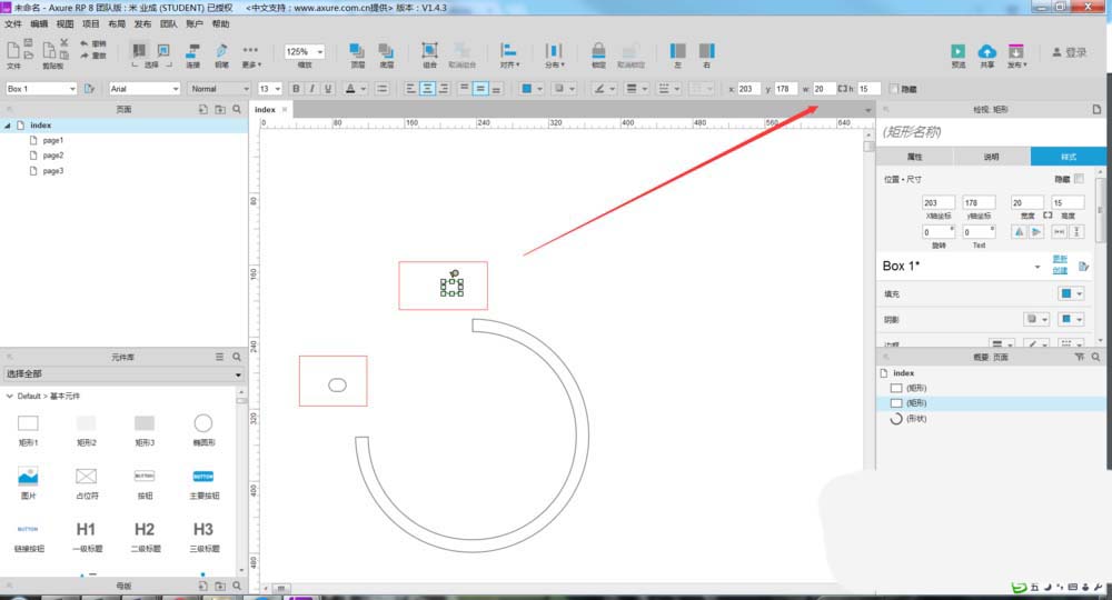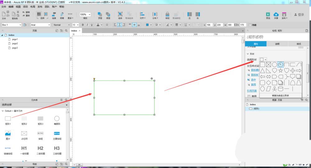 1、首先创建空白页面,在工作区域拖入一个矩形元件,并将其形状修改为扇形的样子,这里在属性中找到形状设置即可,如下图所示。
