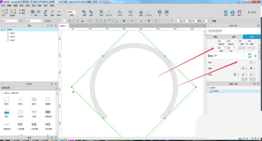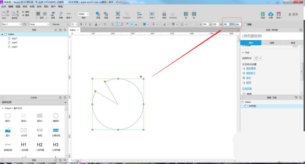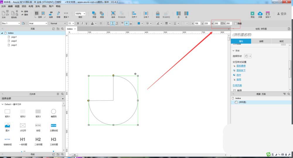 2、形状设置完成后,将形状的宽高修改为260,这里需要先按照这个尺寸去做,因为后面还有其他形状拼接过来。