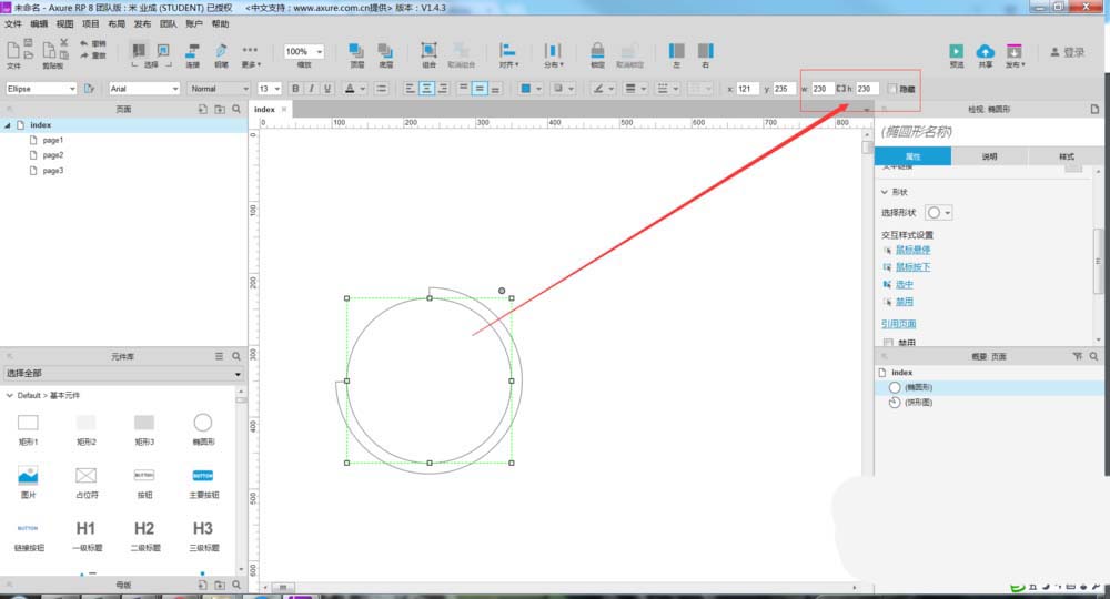 5、将椭圆形放至扇形的中间位置,并将圆形的宽度和高度修改为230,如下图所示。