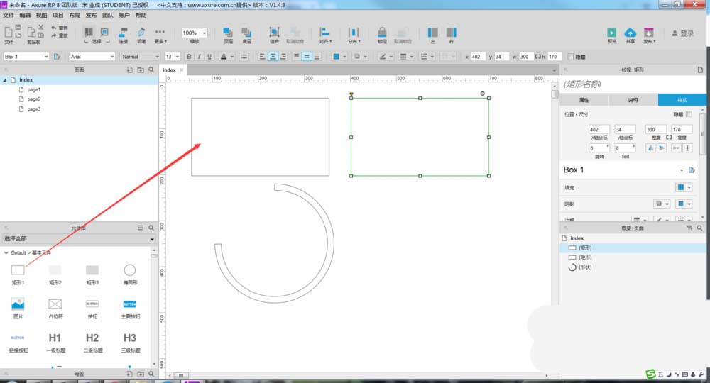 8、下面,在工作区域拖入两个矩形,这两个矩形有准备做仪表盘圆角的效果,如下图所示。