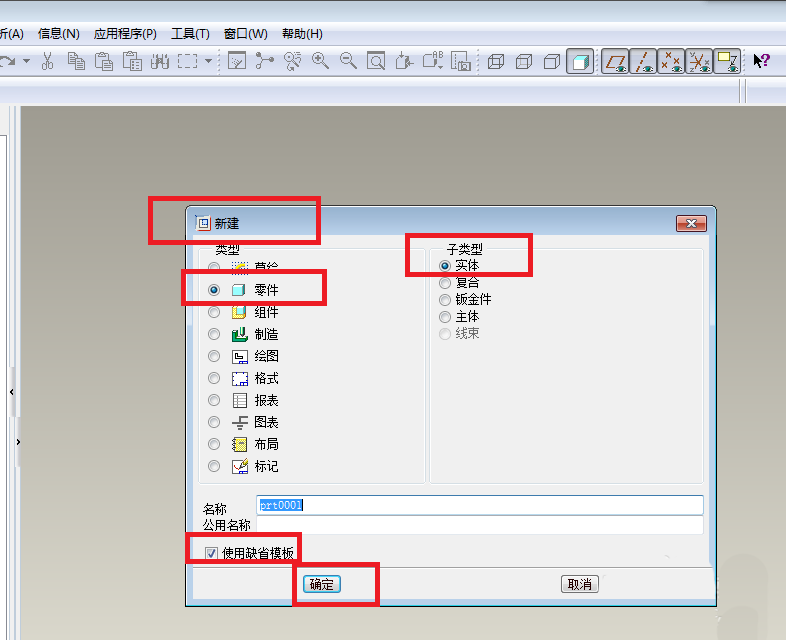 1、如下图所示,打开Pro/e5.0软件,新建一个实体零件,默认勾选使用缺省模板,最后点击“确定”。
