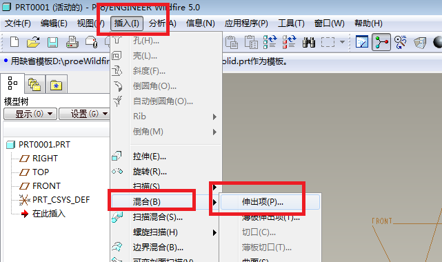 2、如下图所示,Pro/e成功进入到三维建模的状态,然后点击工具栏中的“插入”,在其弹出的下拉菜单中点击“混合”,在最后一层下拉菜单中点击“伸出项”。