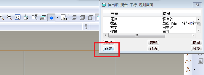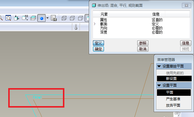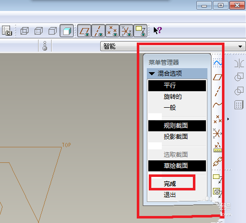 4、如下图所示,出现了一个“伸出项:混合,平行,规则截面”对话框,然后菜单管理器有变化了,可以点击其中的“完成”。