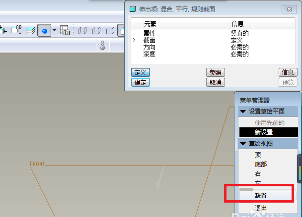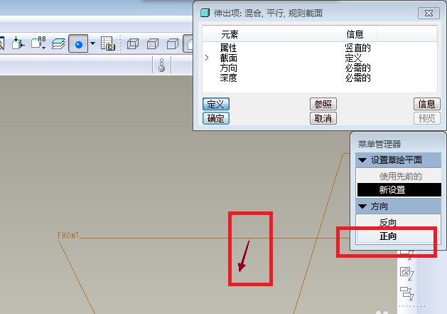 5、如下图所示,菜单管理器又有了变化,这时,我们点击三个基准面中的“FRONT”面。