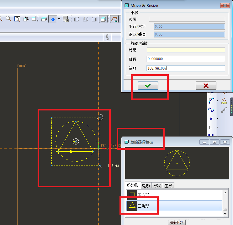 8、如下图所示,成功进入到草绘状态,点击右边工具箱中的“调色板”图标,再在弹出的“草绘器调色板”对话框中找到三角形,并用鼠标左键双击它,再在草绘平面空白区域单击鼠标左键,然后点击对话框中的√,然后在点击右边工具箱中的“标注”图标,将三角形的中点定位到坐标原点,至此,这一步完成。