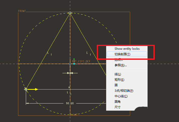 9、如下图所示,在草绘区域空白处长按鼠标右键至出现下图中的下拉菜单为止,(注意,是长按,不能点击一下就松开,那样没用)然后在弹出的下拉菜单中点击“切换剖面”。这一步至关重要。