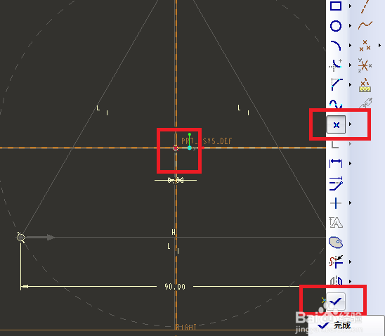 10、如下图所示,点击右边工具箱中的“点”图标,在坐标原点点击一下,创建一个点,最后点击右边工具箱中最下方的√(完成图标),至此,完成截面草绘。